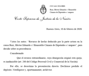 Esto implica que el máximo tribunal no opinó sobre su expulsión de la Legislatura, por considerar que la presentación de Ruiz tenía falencias formales, por lo que decidió no intervenir en el caso. Esto implica que la medida contra el dirigente bandeño queda firme.
