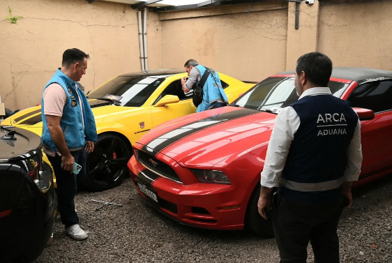 Respecto de los vehículos, los cuales están radicados en Paraguay, son dos Chevrolet Camaro y dos Ford Mustang cuyos valores ampliamente superan los $100 millones por unidad y también una camioneta Toyota SW4 de matrícula argentina.