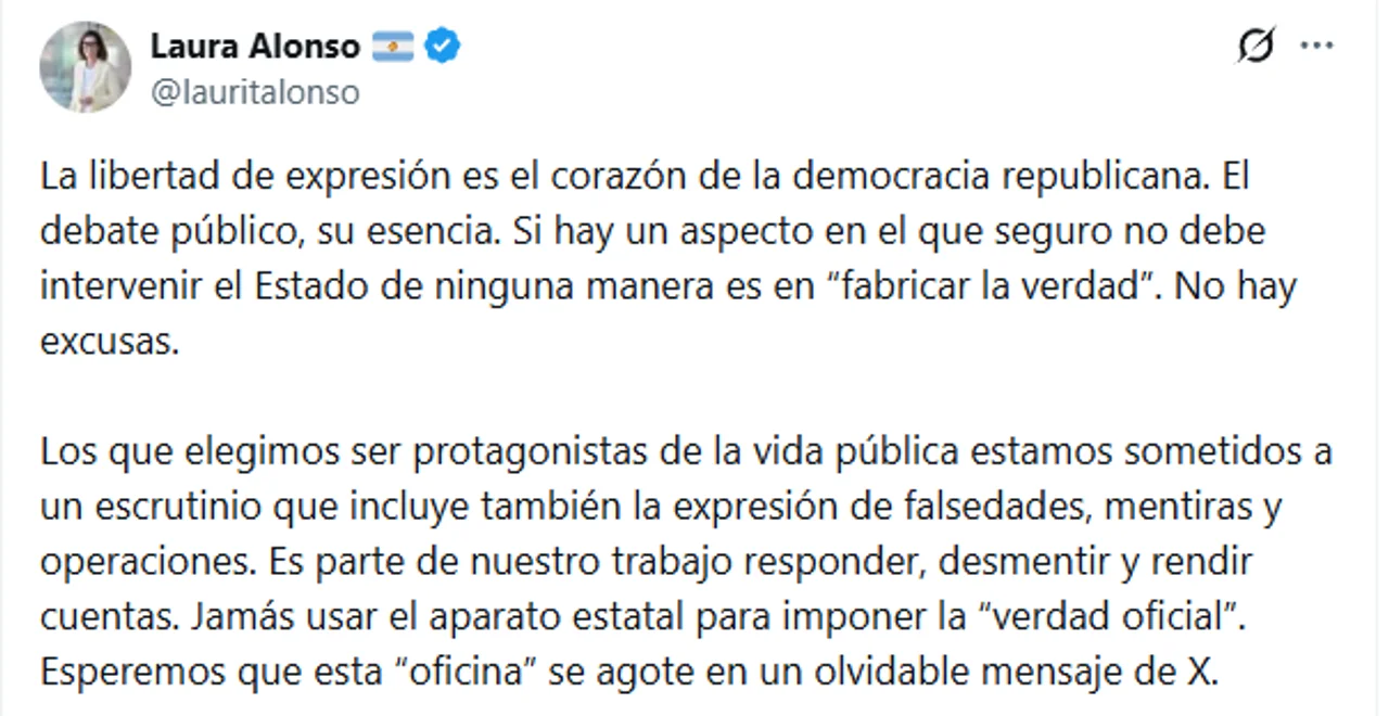 En una advertencia directa sobre el uso de recursos públicos para la batalla cultural, Alonso sentenció: “Jamás usar el aparato estatal para imponer la ‘verdad oficial'”. Finalmente, desestimó la trascendencia de la nueva dependencia con una frase lapidaria: “Esperemos que esta ‘oficina’ se agote en un olvidable mensaje de X”.