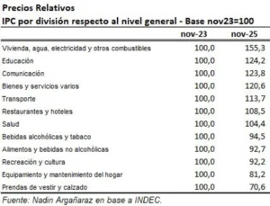 El informe publicado por Noticias Argentinas indicó que “entre noviembre de 2023 y noviembre de 2025 siete componentes aumentaron su precio relativo y cinco lo bajaron”.