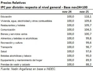 A contramano de lo que podía pensarse, el trabajo reveló que “la salud es el servicio que menos aumentó su precio relativo entre ambos meses, con un 4,4%. En el otro extremo, las prendas de vestir y calzado son los bienes que más abaratamiento relativo tuvieron entre noviembre de 2023 y noviembre de 2025.