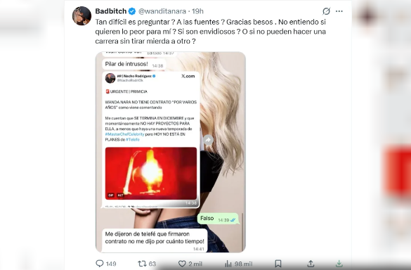 A través de su cuenta de X, Wanda Nara expuso un mensaje de una persona vinculada a Intrusos preguntándole por una “primicia” del periodista de espectáculos Nacho Rodríguez.