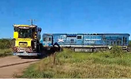 Un tren sojero y un camión con maquinaria agrícola protagonizaron un fuerte accidente este domingo por la mañana, en el paso a nivel “Chito”, a unos 3 km del casco urbano de Hermoso Campo.